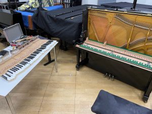 Servicing two Yamaha U1 upright pianos. Work included reshaping the hammers and full regulation of the action.